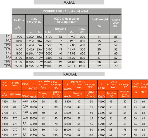 They are used in factories, workshops, sheds, garages, gyms, etc. They are manufactured 90/70 ° C hot water, from 4,000 to 24,000 kcal / h, with radial fan in the 6,000 to 42,000 kcal / h capacity under working conditions.They are manufactured to run with hot water and steam if needed.Axial fans are used for ceiling height up to 4 m of the closed areas. Using radial fan is more suitable apparatus for the areas which is higher than 4 m .